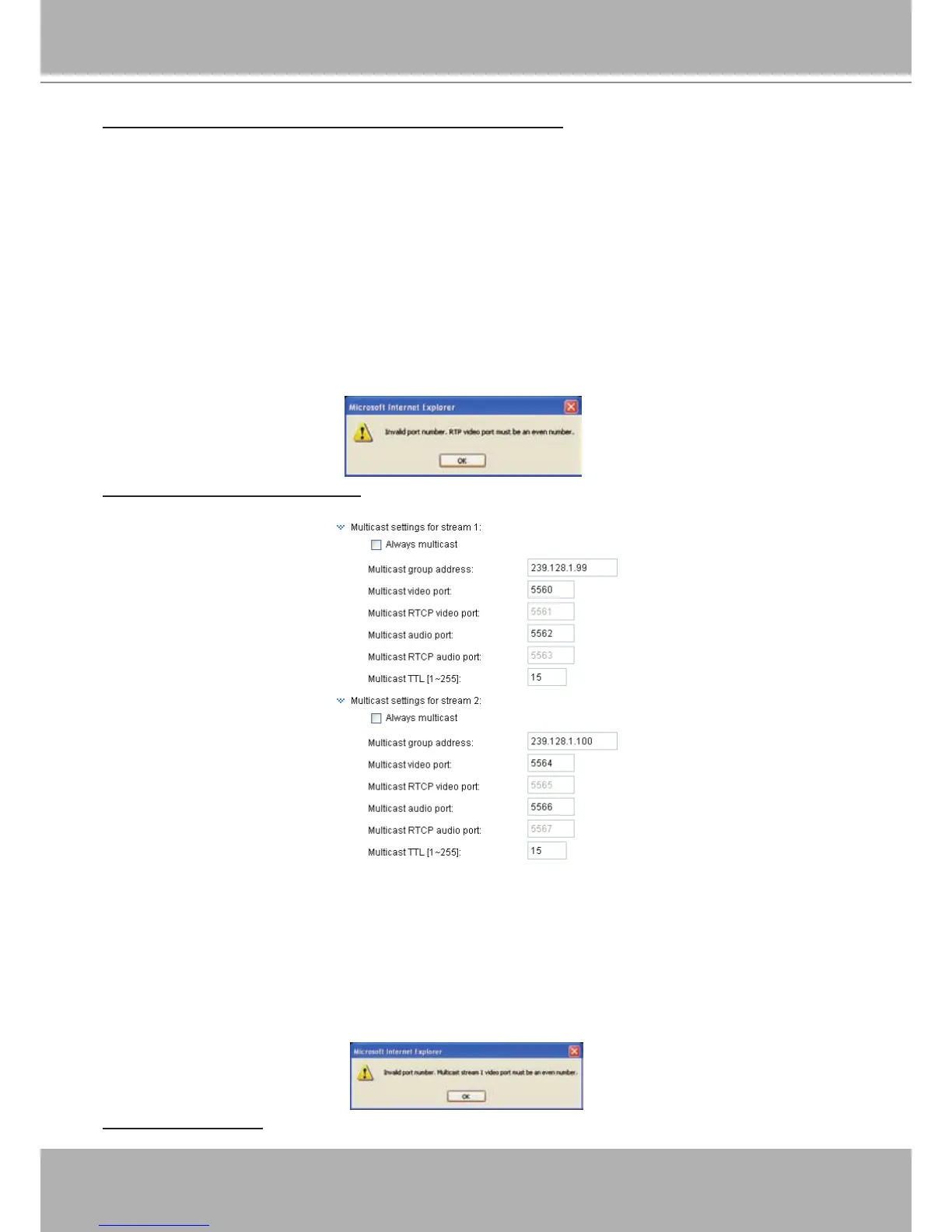 If the multicast RTP video ports are incorrectly assigned, the following warning message will be