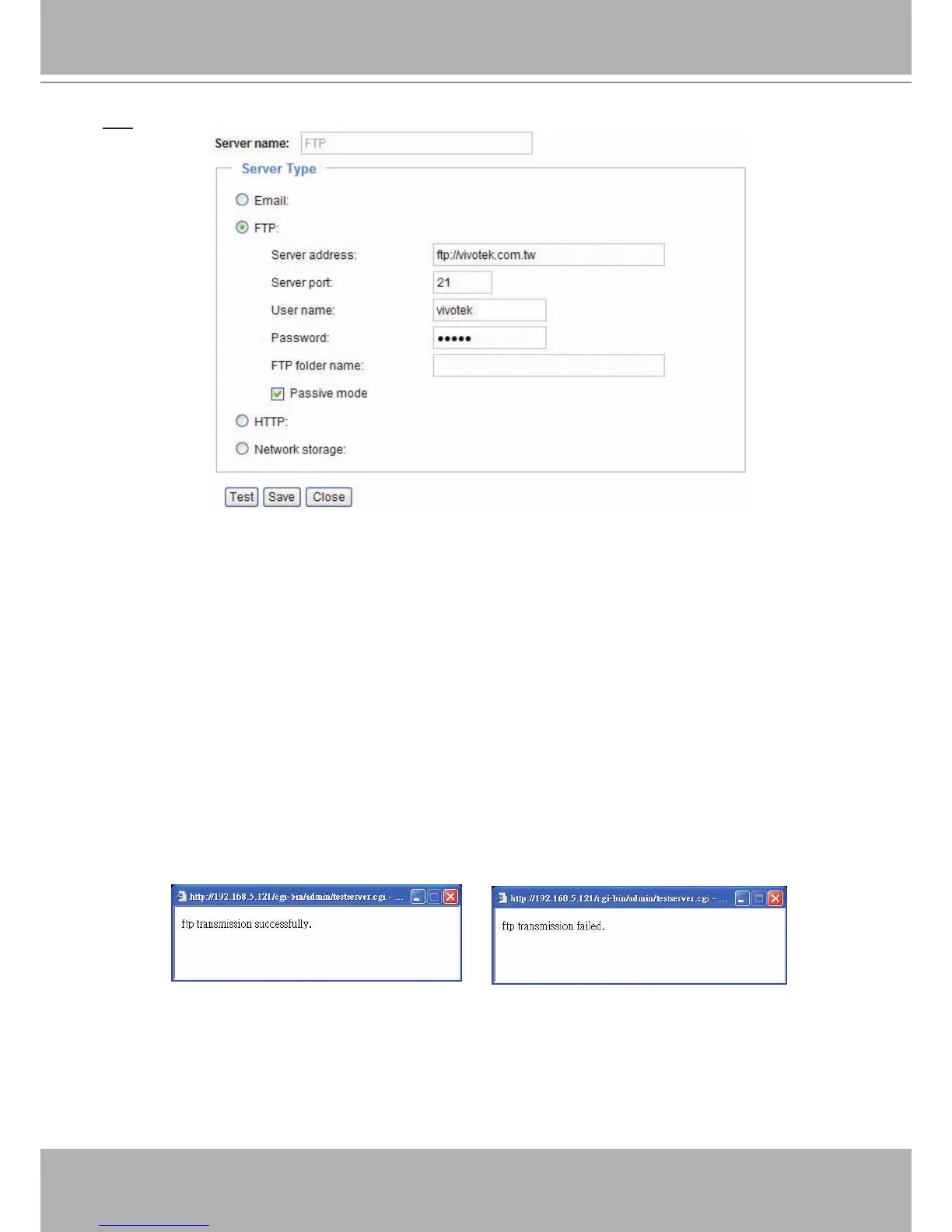 To verify if the FTP settings are correctly congured, click Test� The result will be shown in a pop-up