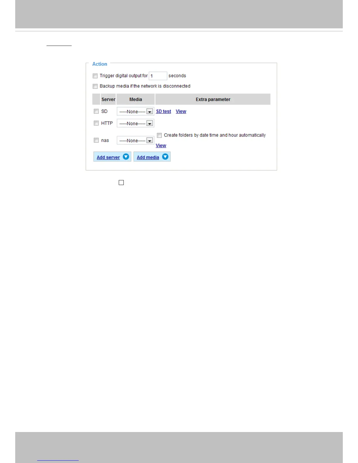 Dene the actions to be performed by the Network Camera when a trigger is activated.