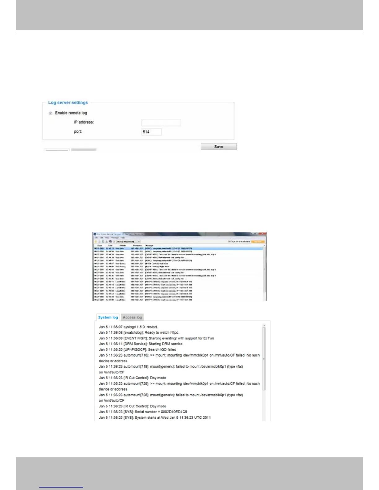 You can congure the Network Camera to send the system log le to a remote server as a log backup.