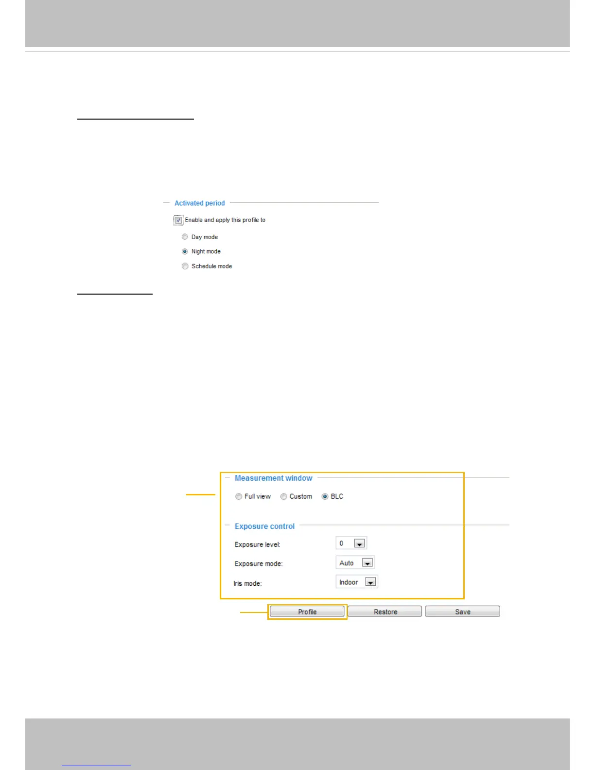 On this page, you can set the Measurement window, Exposure level, Exposure mode, and