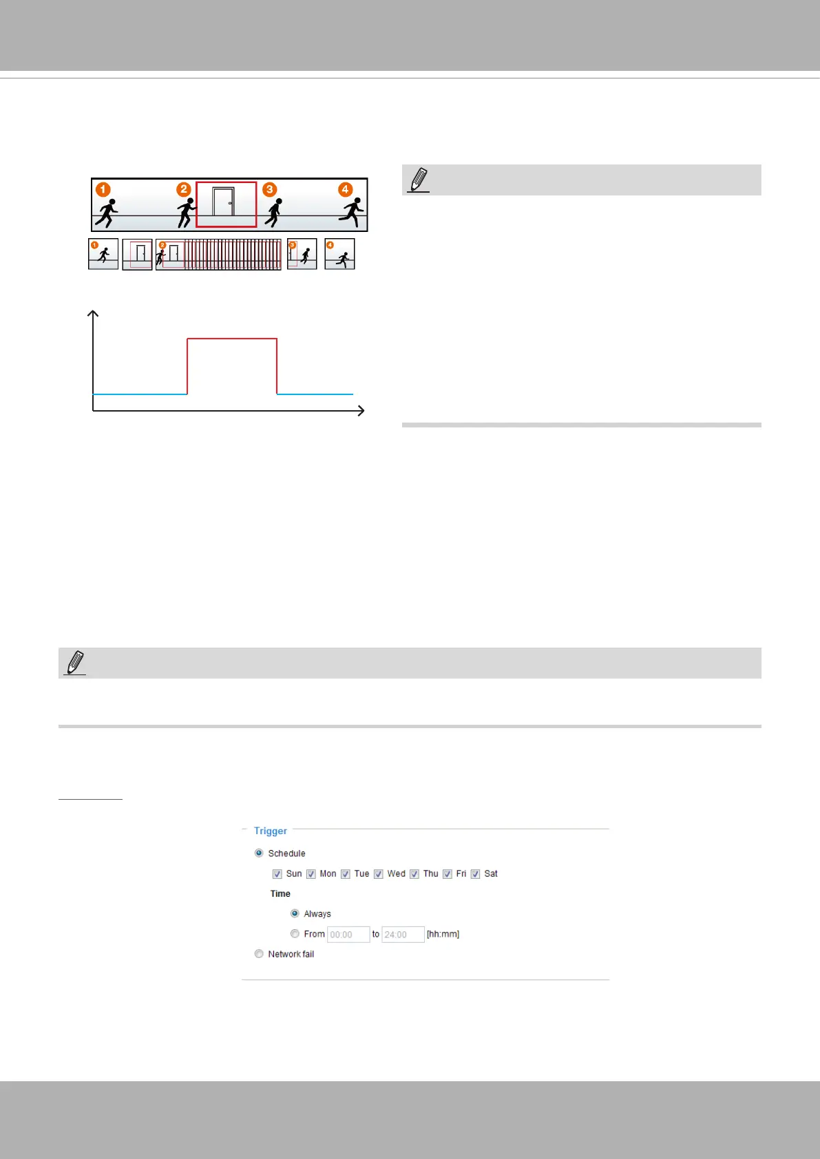 The alarm trigger includes: motion detection and DI detection. Please refer to Event Settings on page 124.