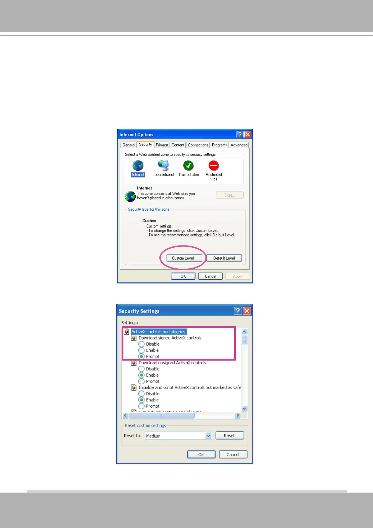 ► If you see a dialog box indicating that your security settings prohibit running ActiveX