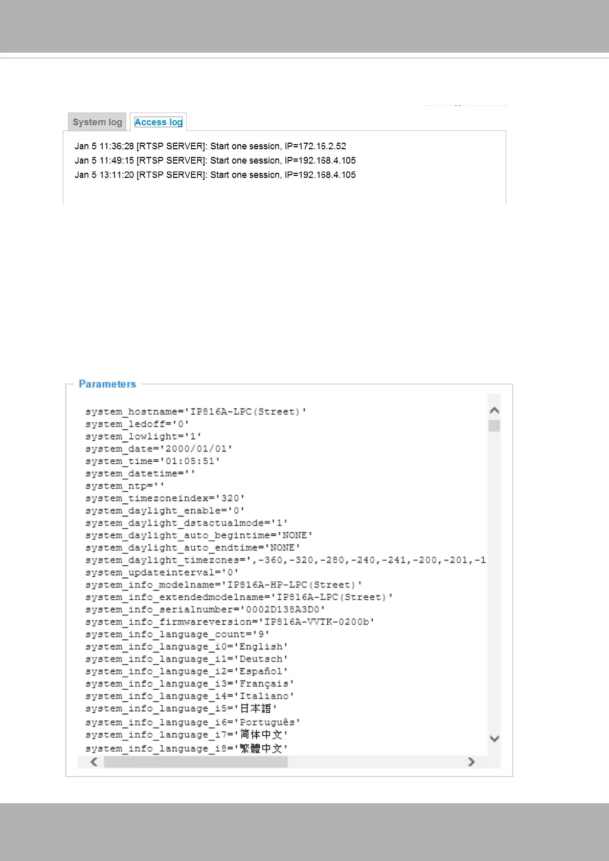 administrators) in a chronological order. The access log is stored in the Network Camera’s buffer
