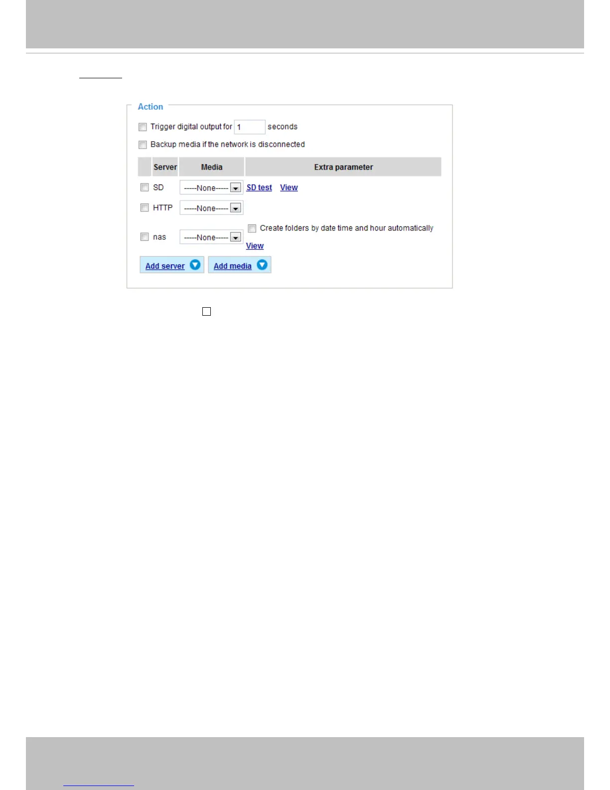 Dene the actions to be performed by the Network Camera when a trigger is activated.
