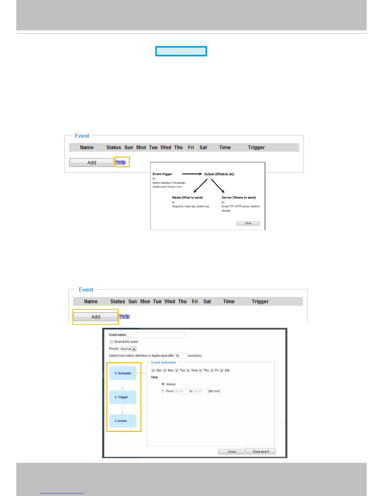 In the Event column, click Add to open the event settings window� Here you can arrange three elements
