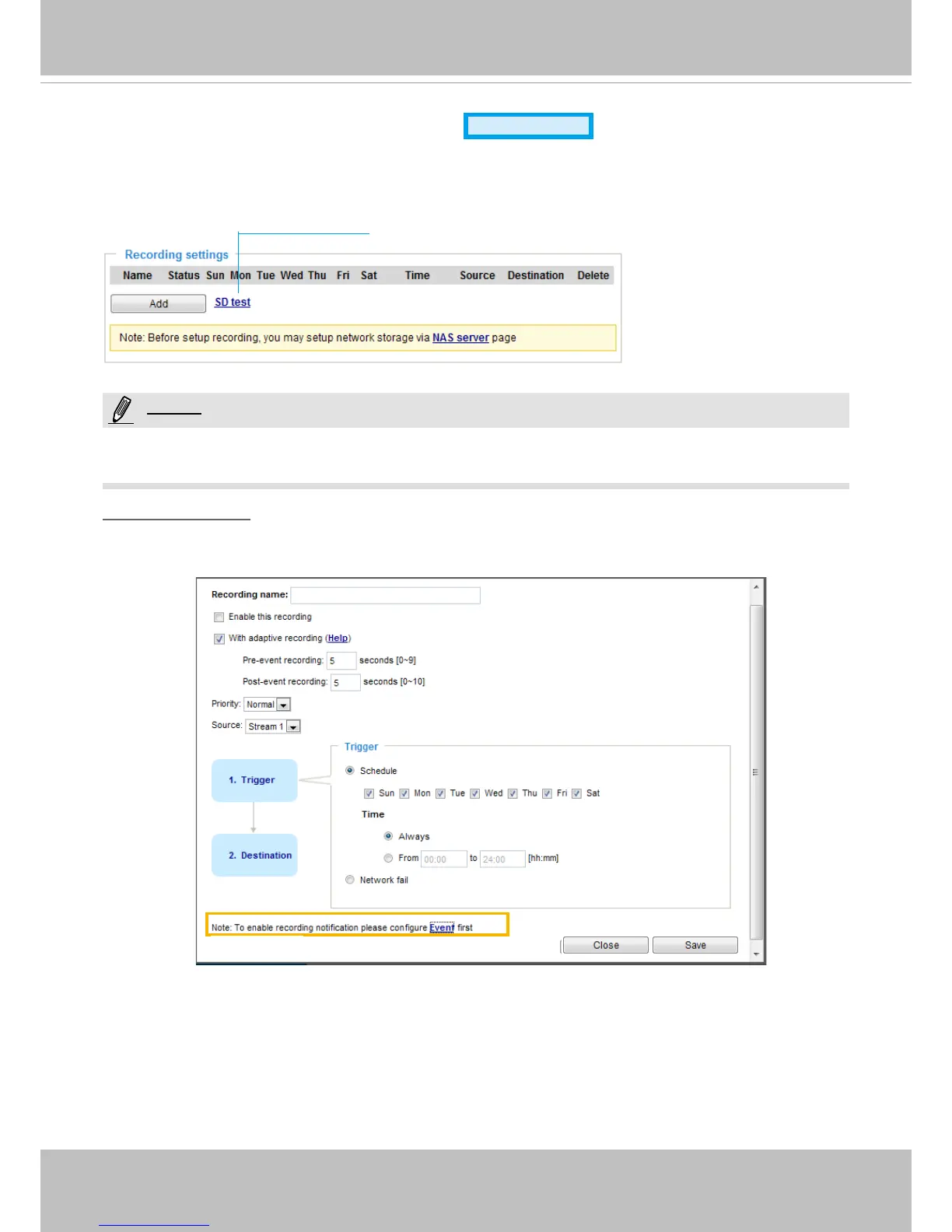 Click Add to open the recording setting window. On this page, you can dene the adaptive recording,