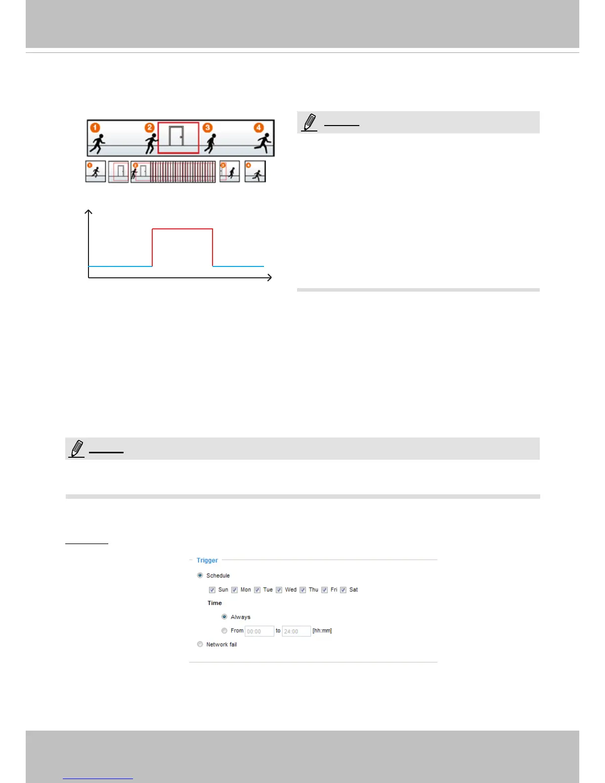 The alarm trigger includes: motion detection, tampering detection, and DI detection. Please refer to Event