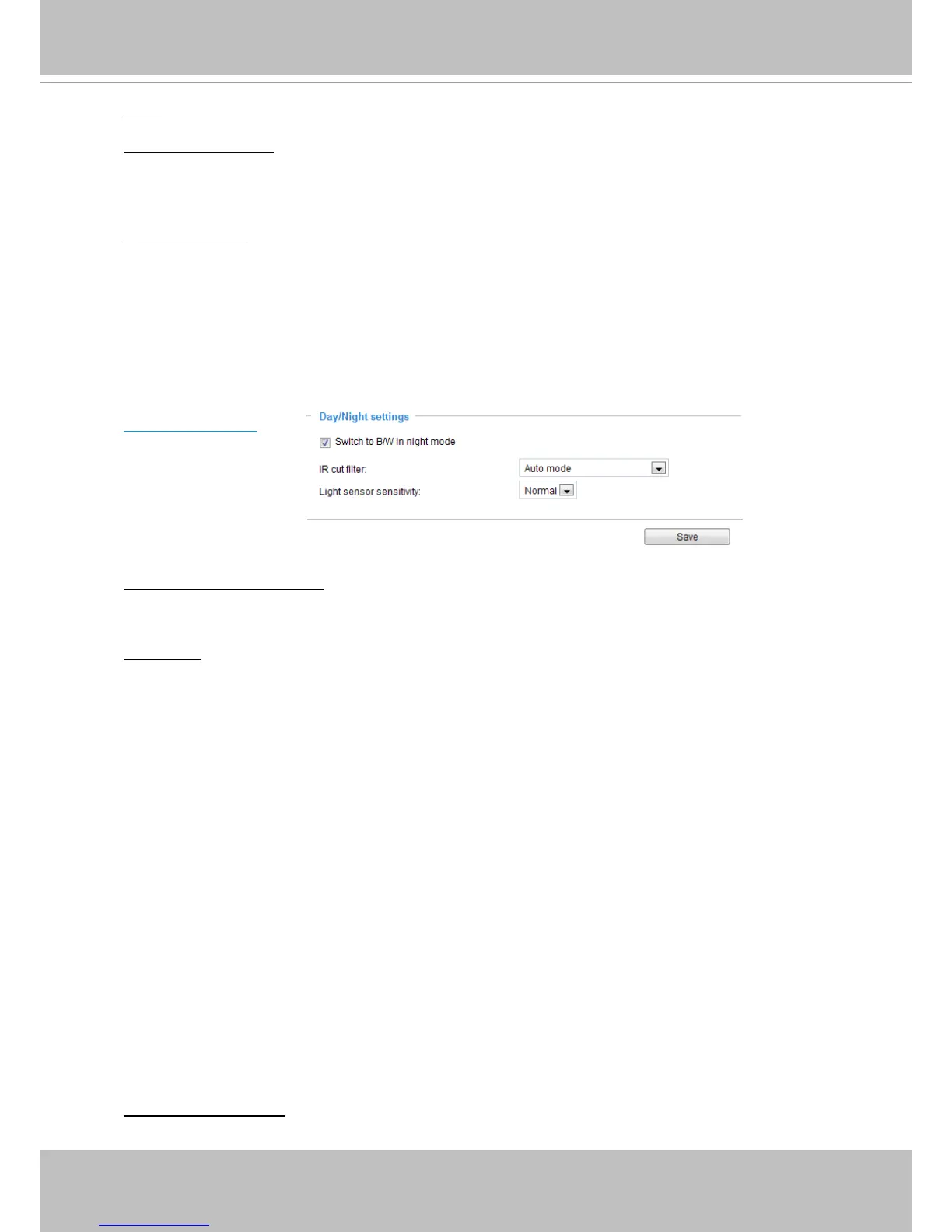 In day mode, the Network Camera switches on the IR cut lter at all times to block infrared light