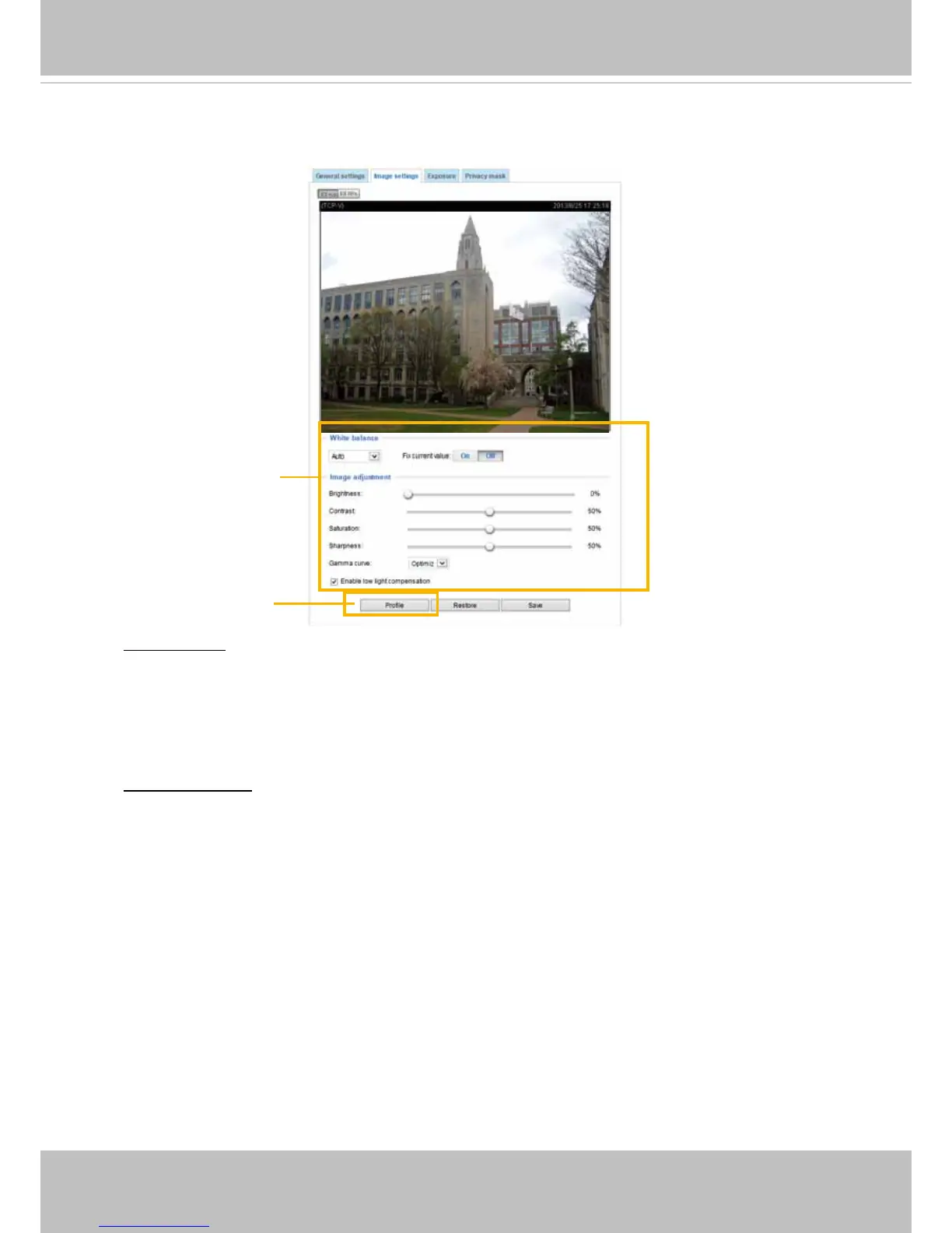 On this page, you can tune the White balance, Image adjustment and low light compensation�