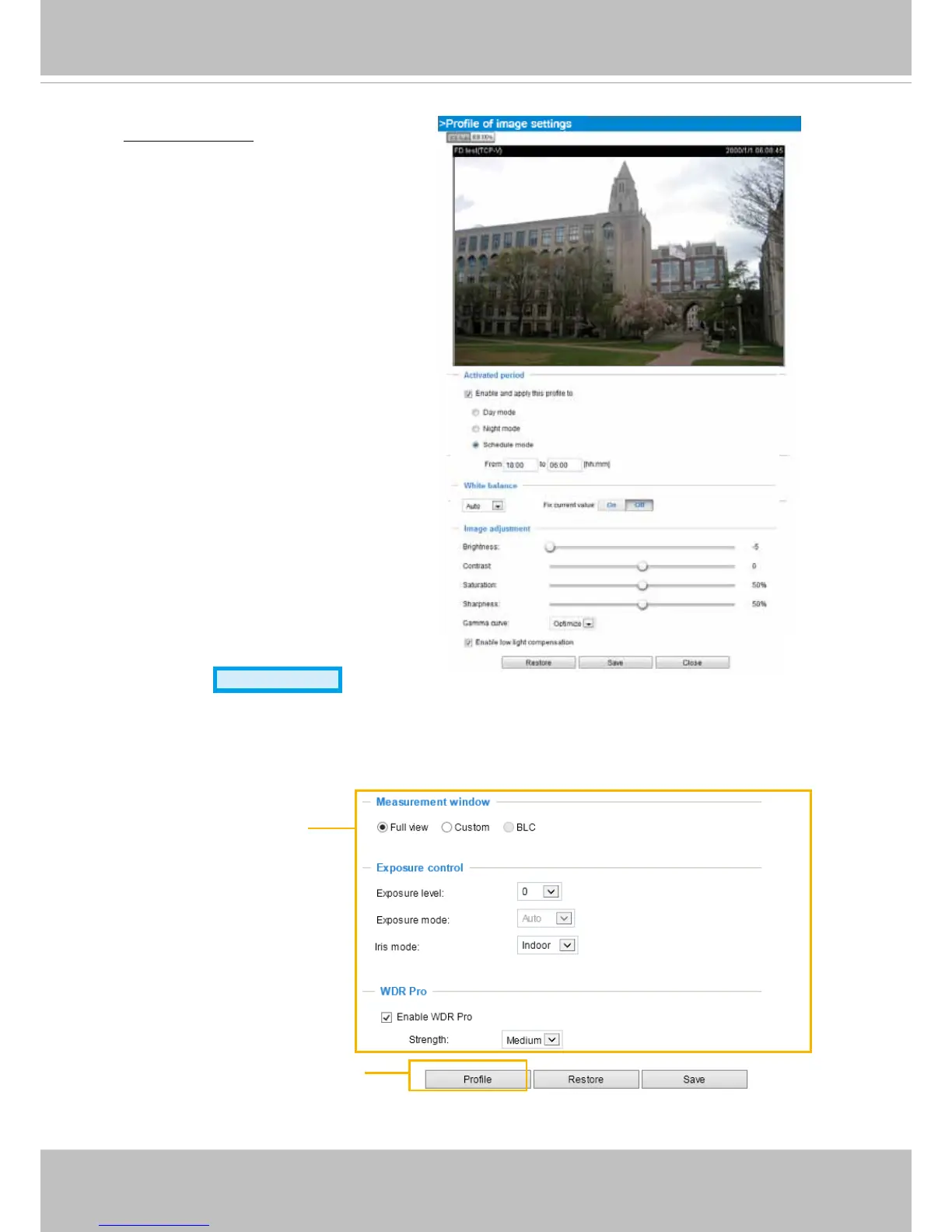 On this page, you can set the Measurement window, Exposure level, Exposure time, and Gain