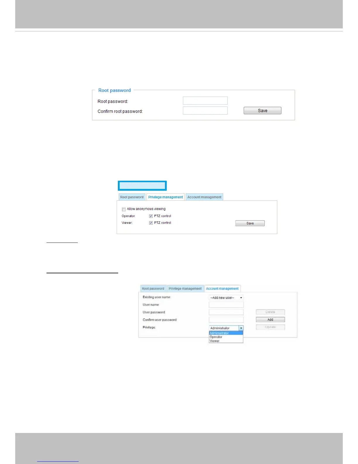 PTZ control: You can modify the management privilege of operators or viewers. Check or uncheck