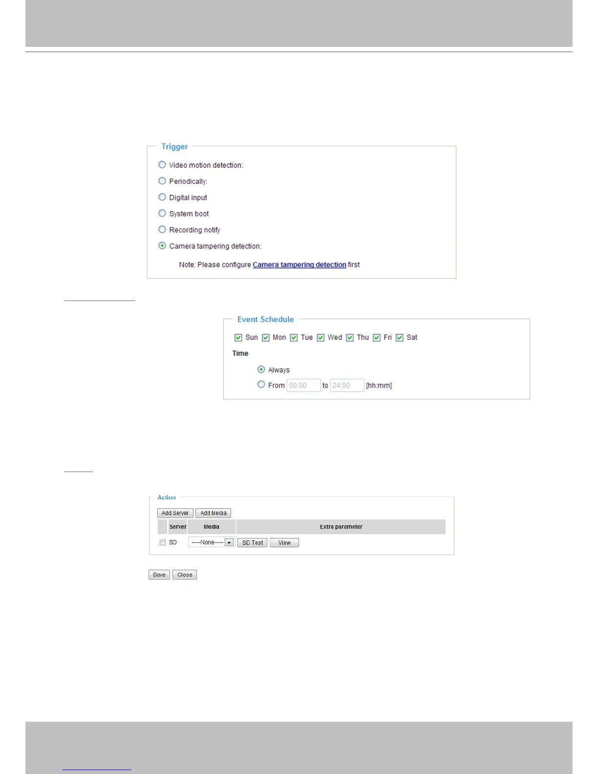 Dene the actions to be performed by the Network Camera when a trigger is activated.