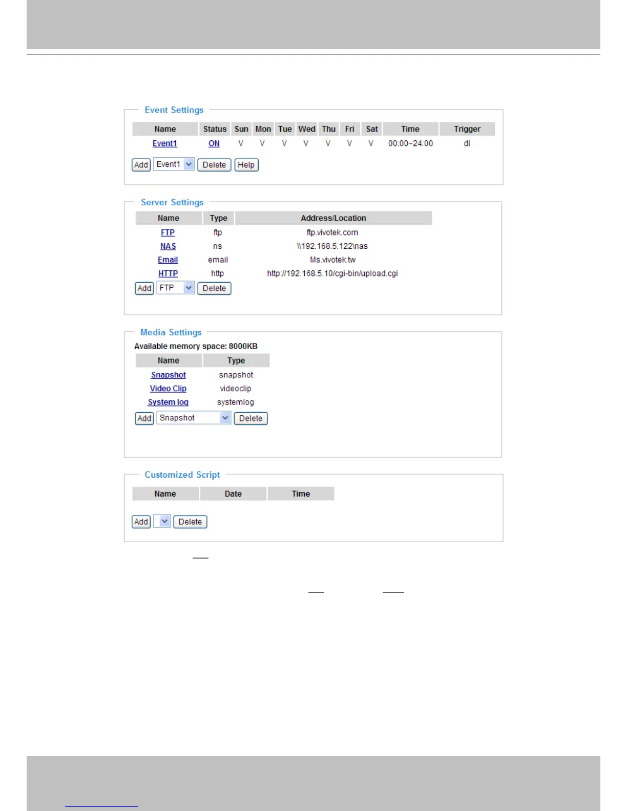 Note that you can only delete a media setting when it is not involved in an event setting.