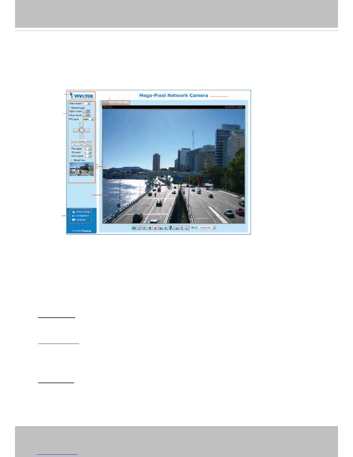 sections: VIVOTEK INC. Logo, Host Name, Camera Control Area, Conguration Area, and Live