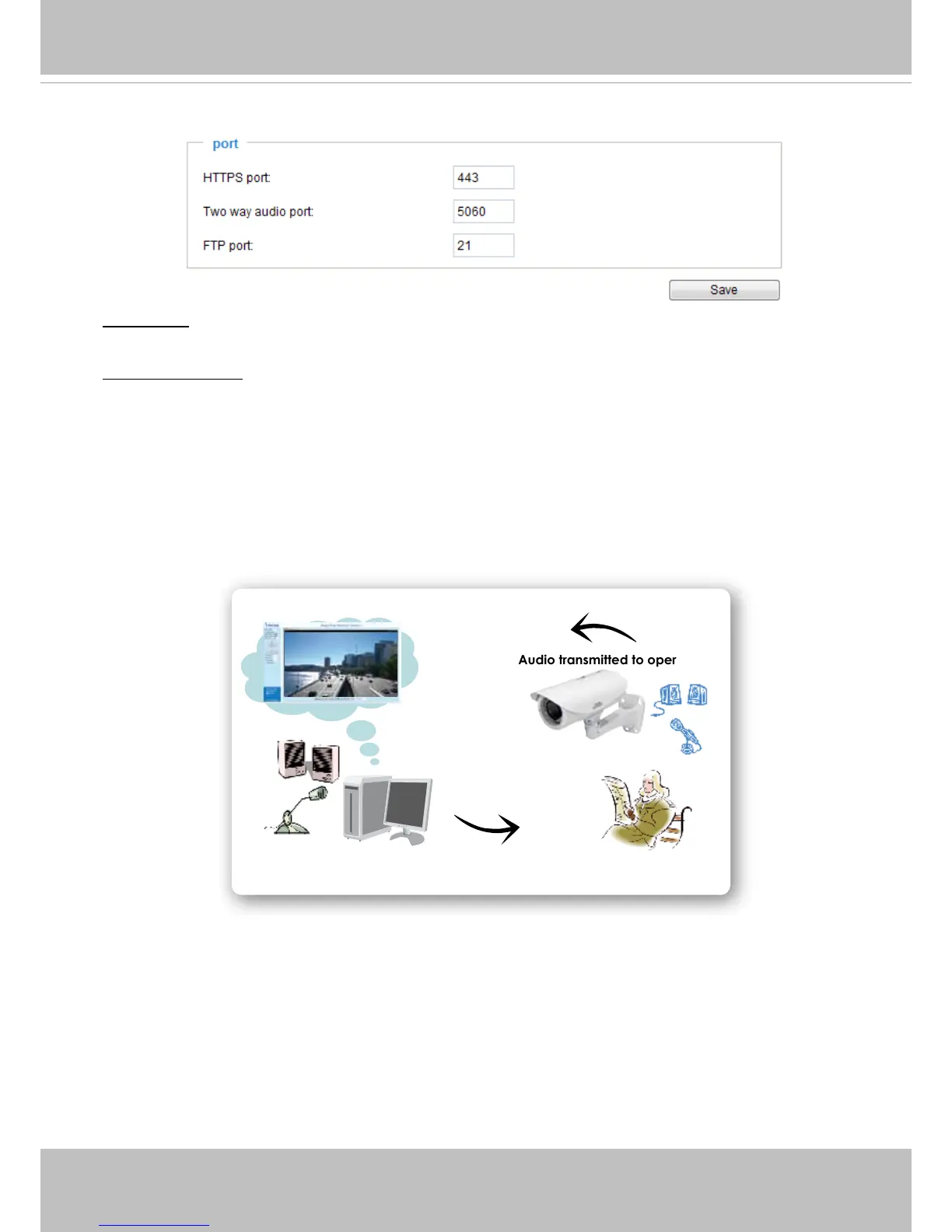Two way audio port: By default, the two way audio port is set to 5060� It can also be assigned to another