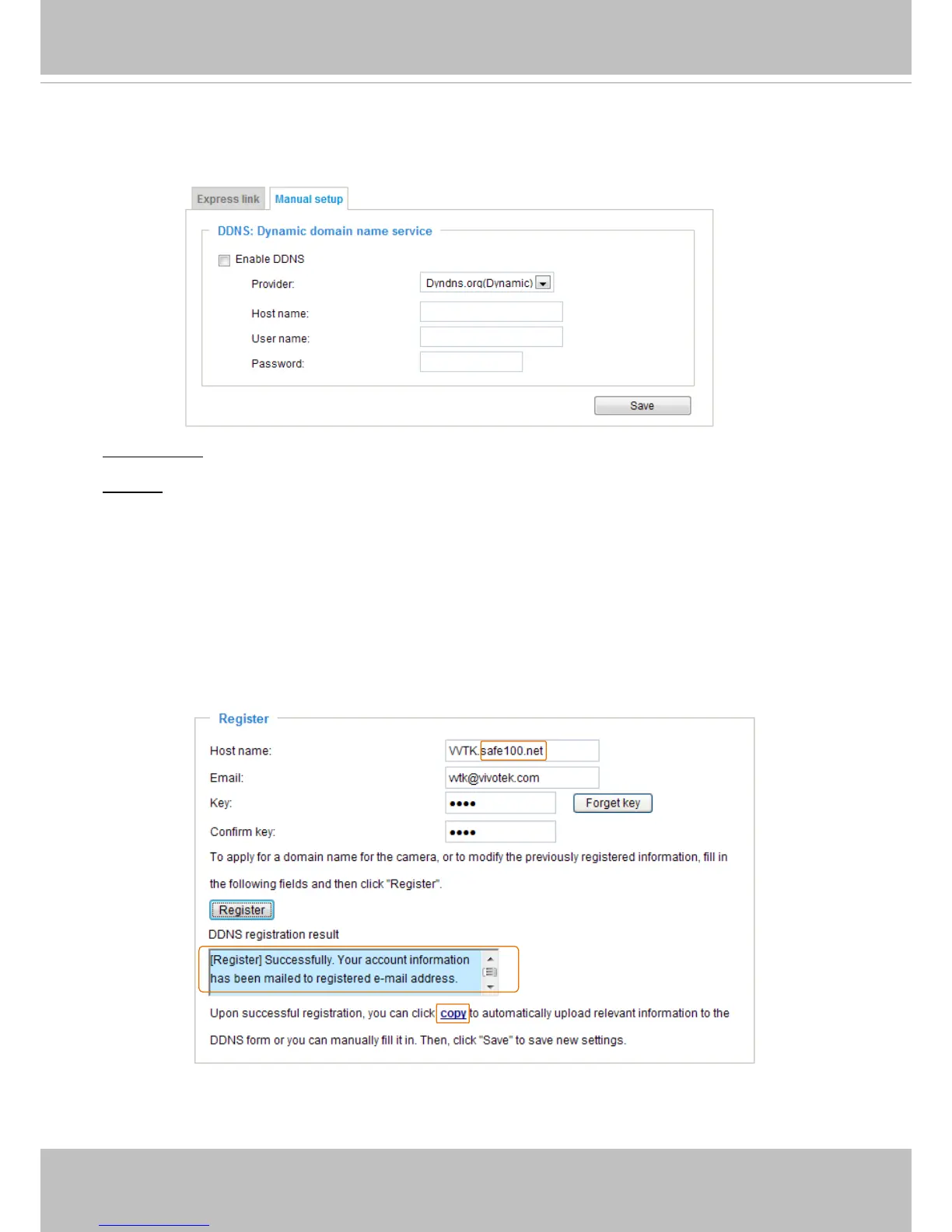 2. In the Register column, ll in the Host name (xxxx.safe100.net), Email, Key, and Conrm Key, and