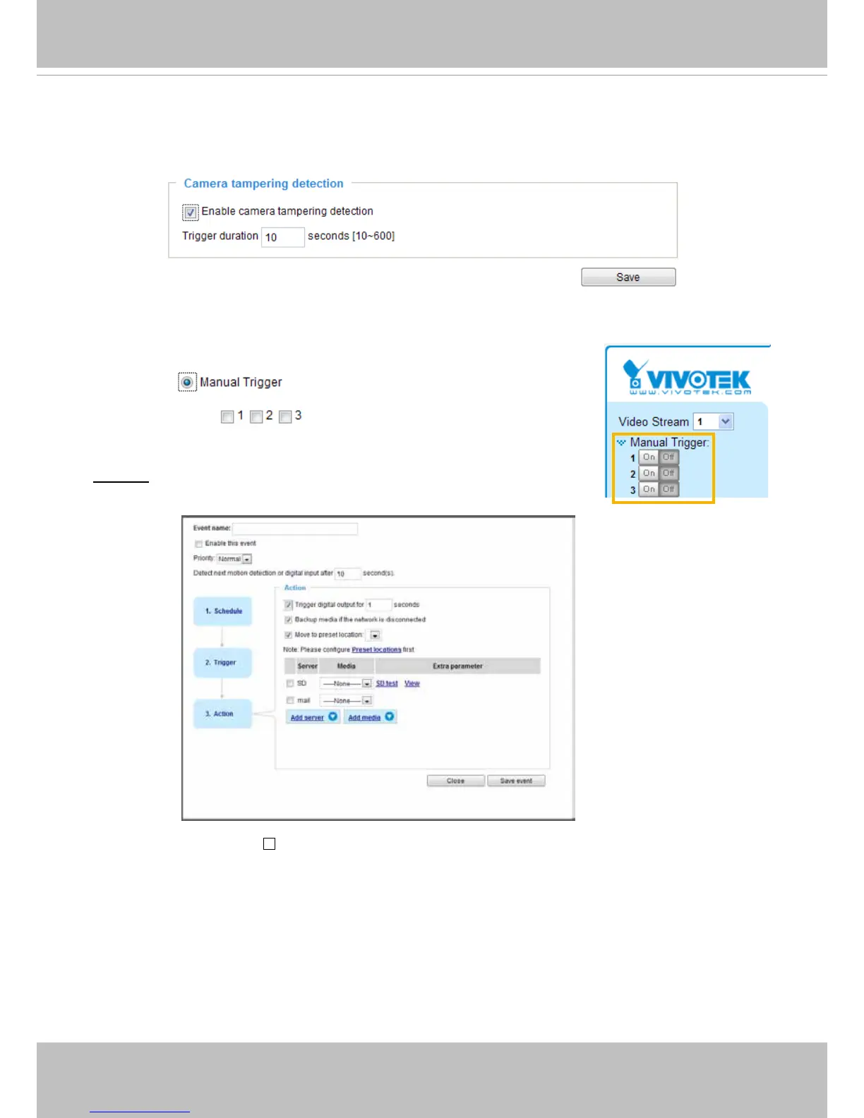 This option allows the Network Camera to trigger when the camera detects that it is being tampered