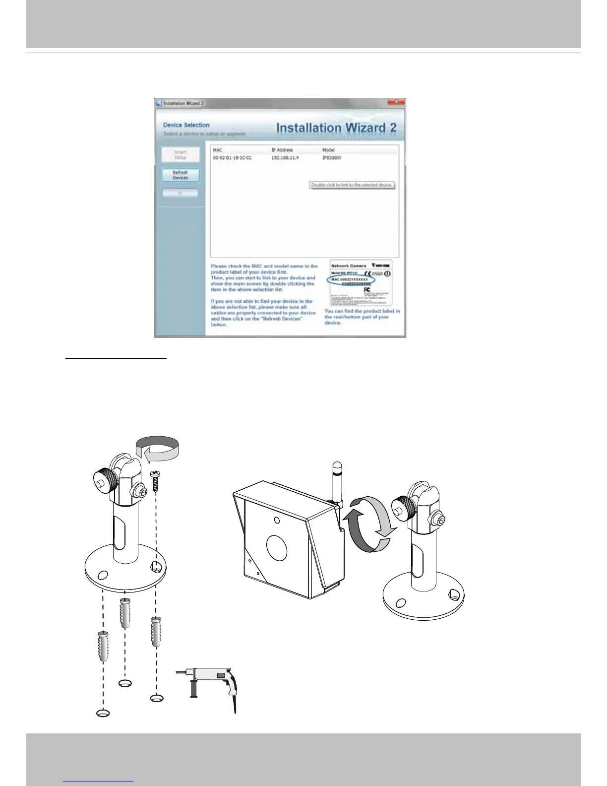 1� Drill holes on a wall or ceiling� 2� Insert the plastic anchors, and then mount the camera stand