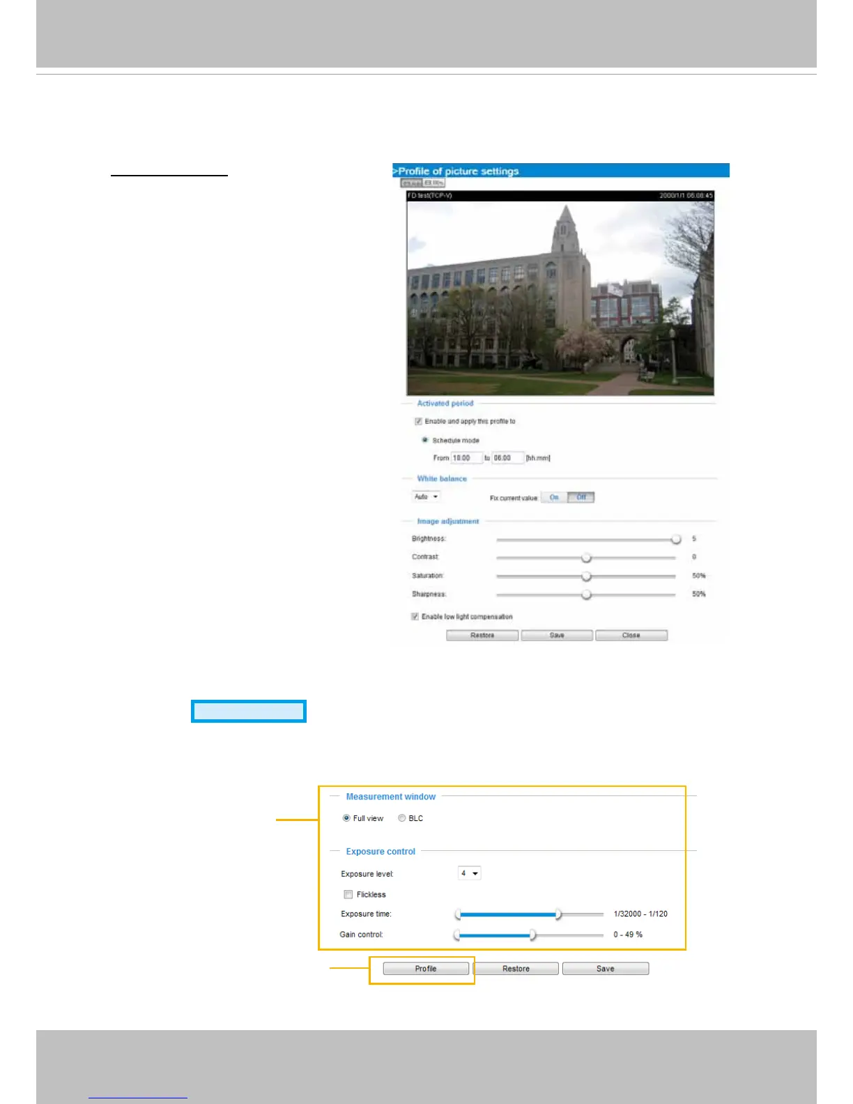 On this page, you can set the Measurement window, Exposure level, Exposure time, and Gain