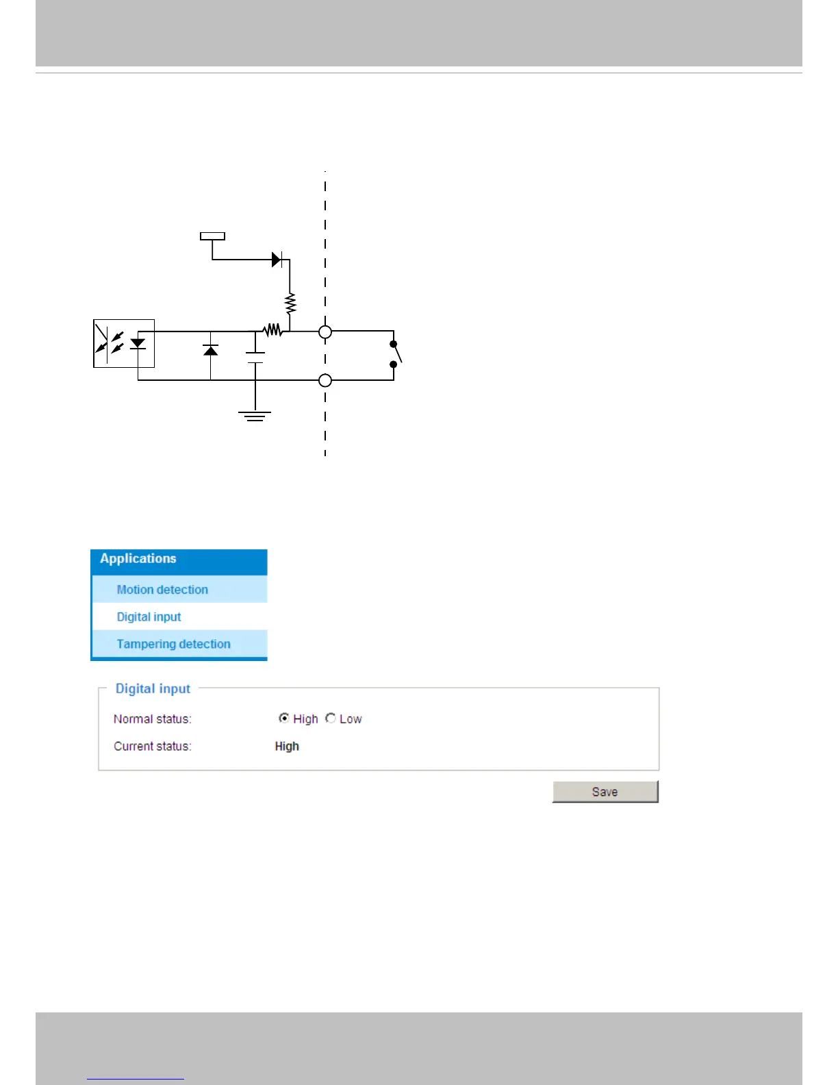 Connect a digital input device to the input pins of the camera� From the Applications > DI and