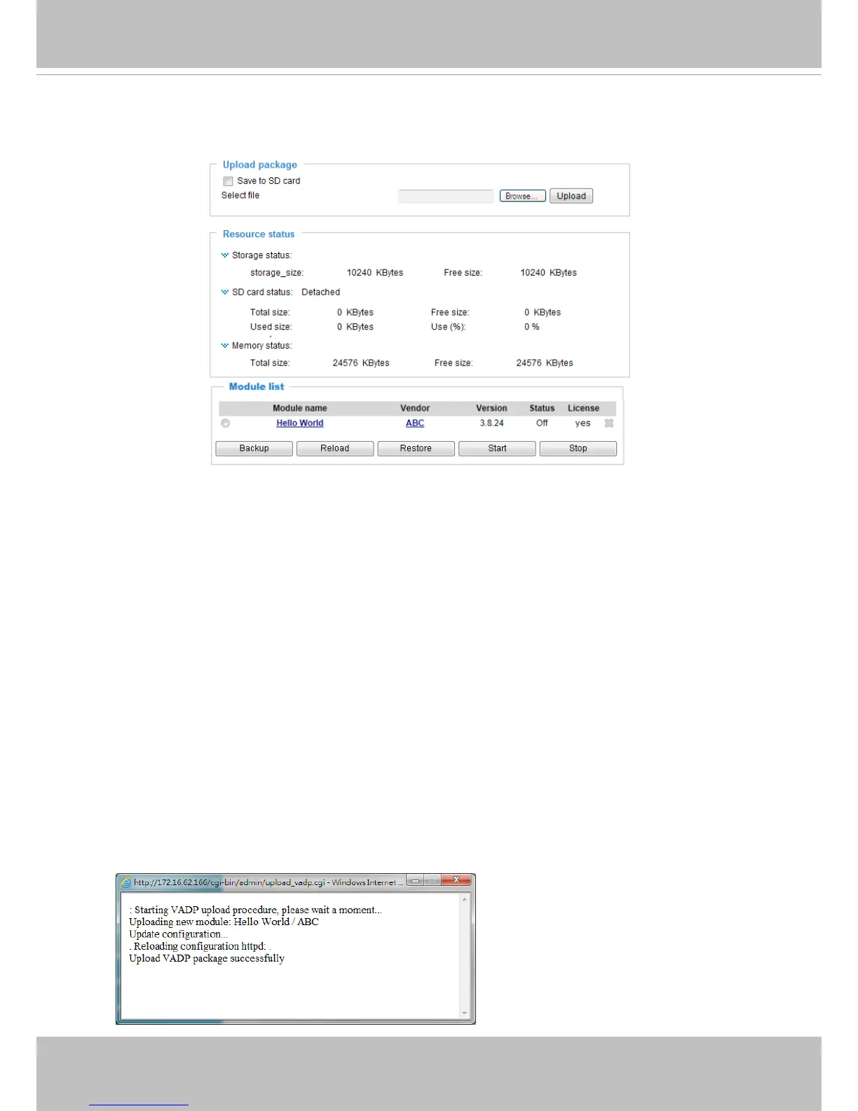 • Once the software package is successfully uploaded, the module conguration (vadp.
