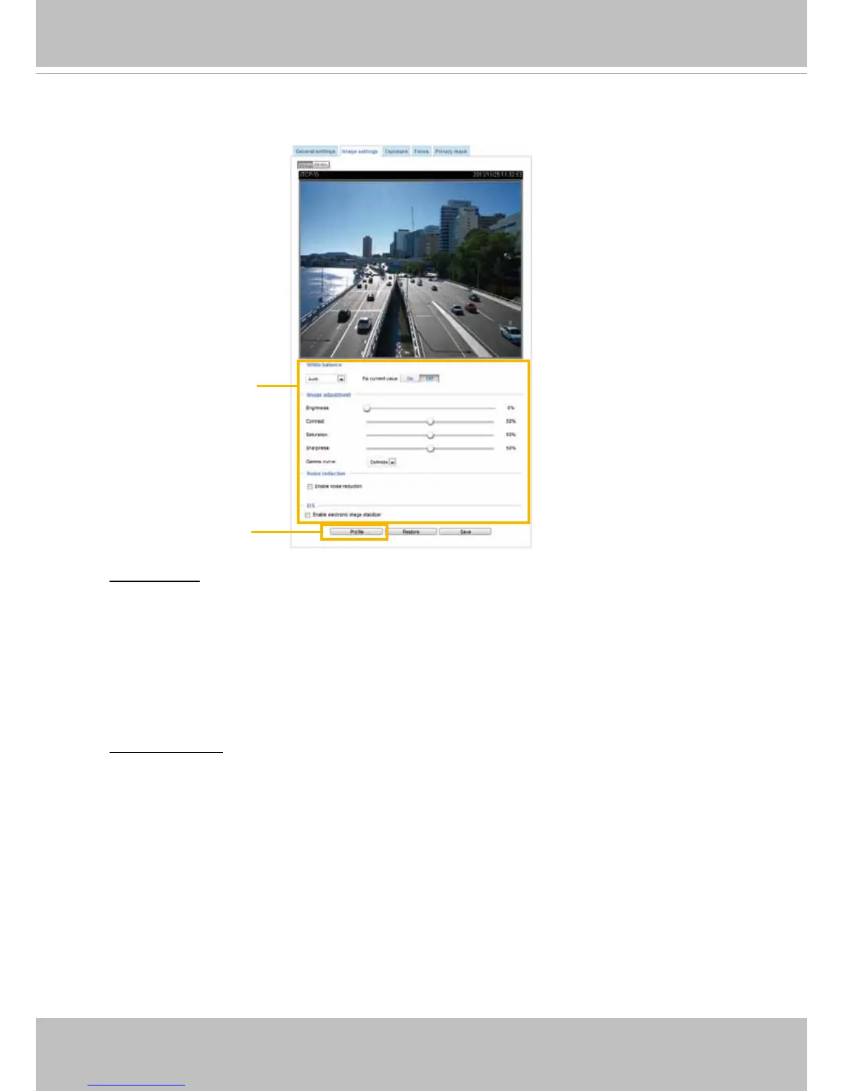 On this page, you can tune the White balance and Image adjustment.