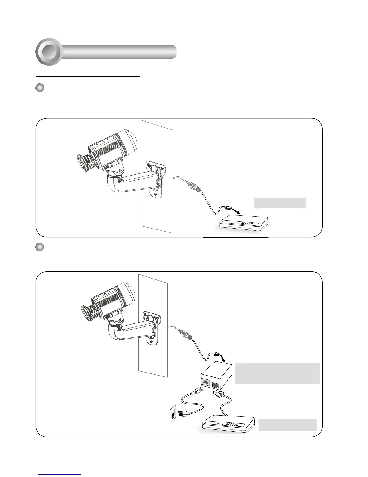 Use a PoE power injector (optional) to connect between the Network Camera and a non-PoE