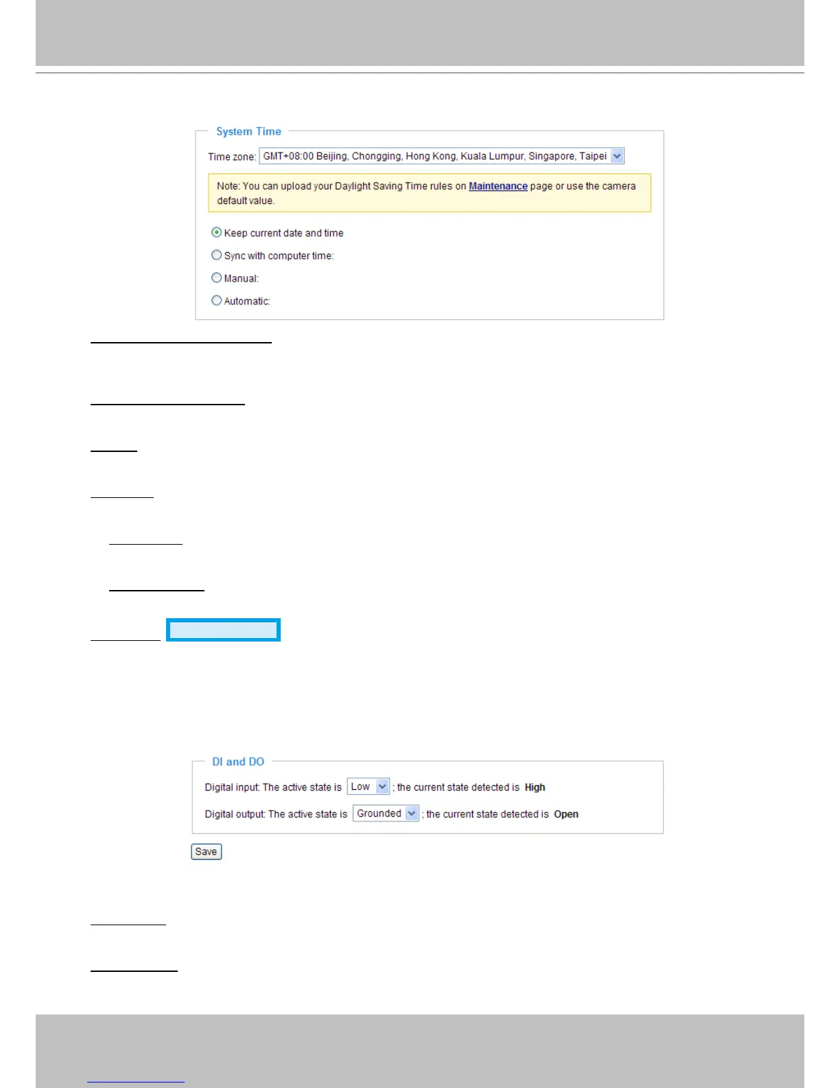 Digital input: Select High or Low to dene normal status for the digital input. The Network Camera will