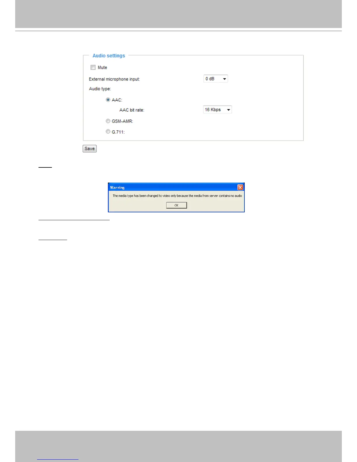 Audio type: Select audio codec AAC or GSM-AMR and the bit rate.