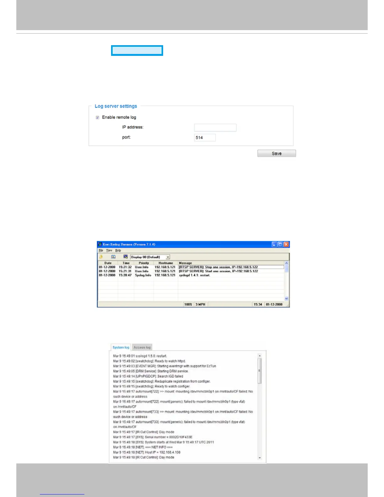 messages from the Network Camera. An example is Kiwi Syslog Daemon. Visit http://www.kiwisyslog.
