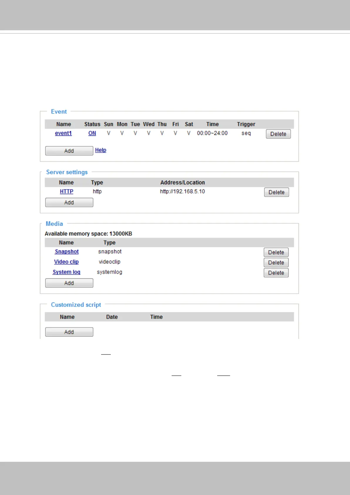 In the Event settings column, the Servers and Medias you congured will be listed; please make sure the
