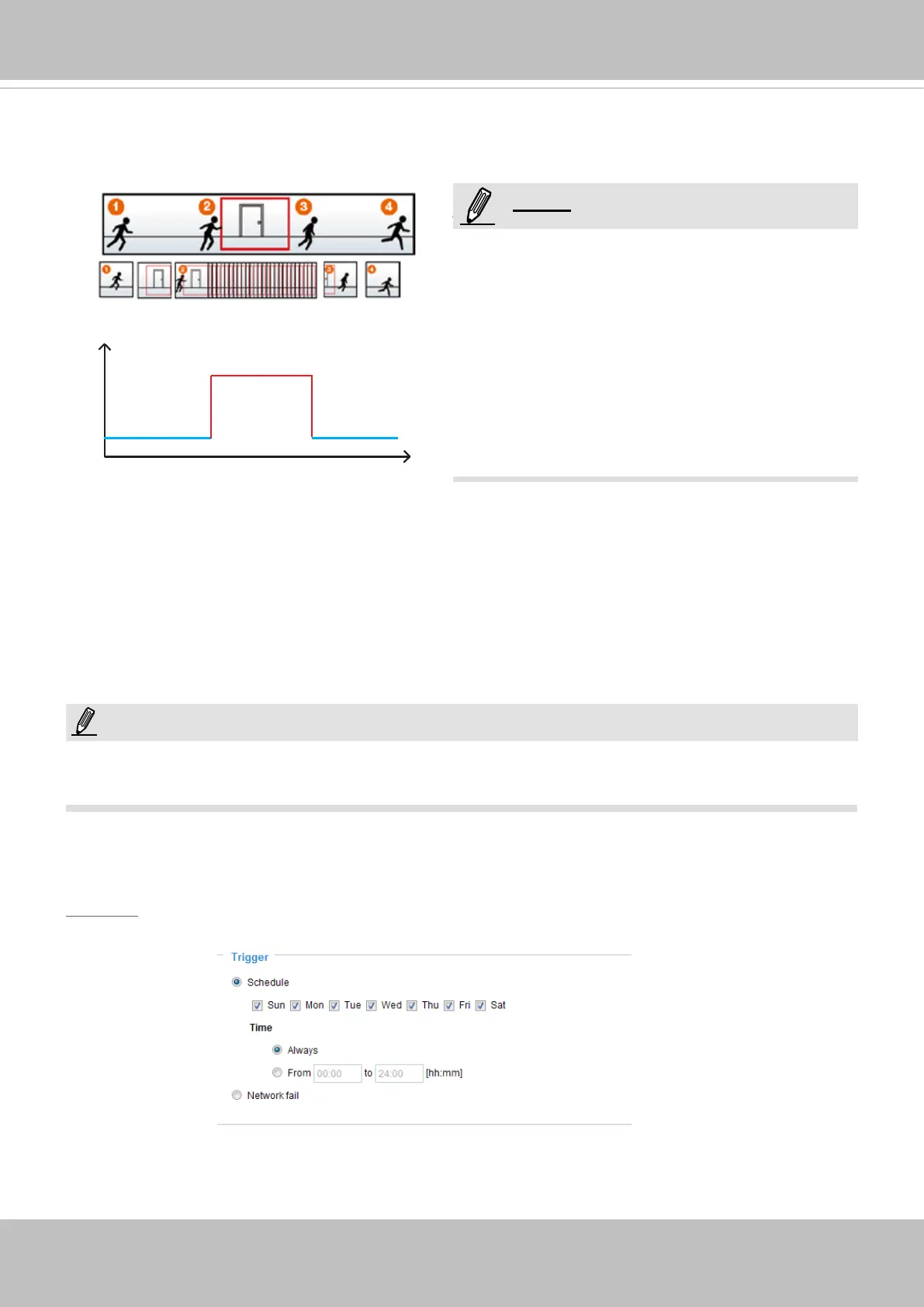 The alarm trigger includes: motion detection and DI detection. Please refer to Event Settings on page 98.