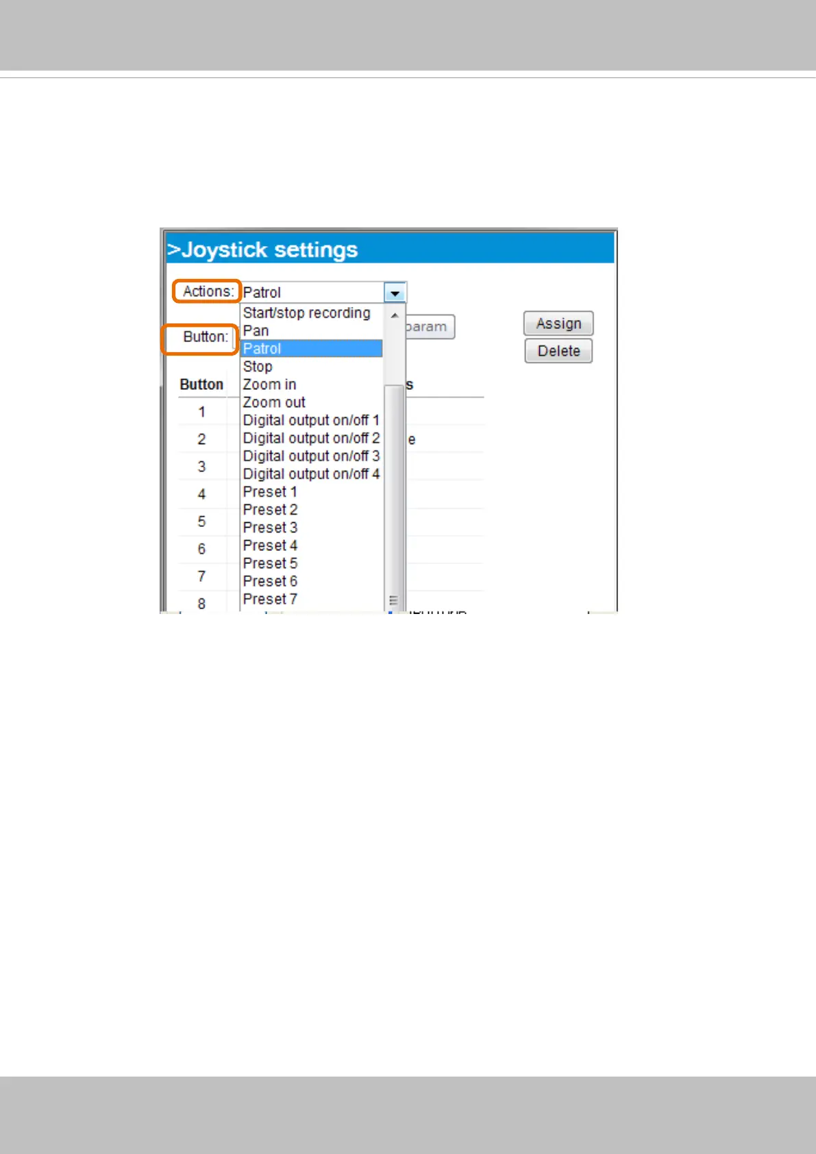 For example: Assign Preset 1 (move to preset 1 position) to Button 1.
