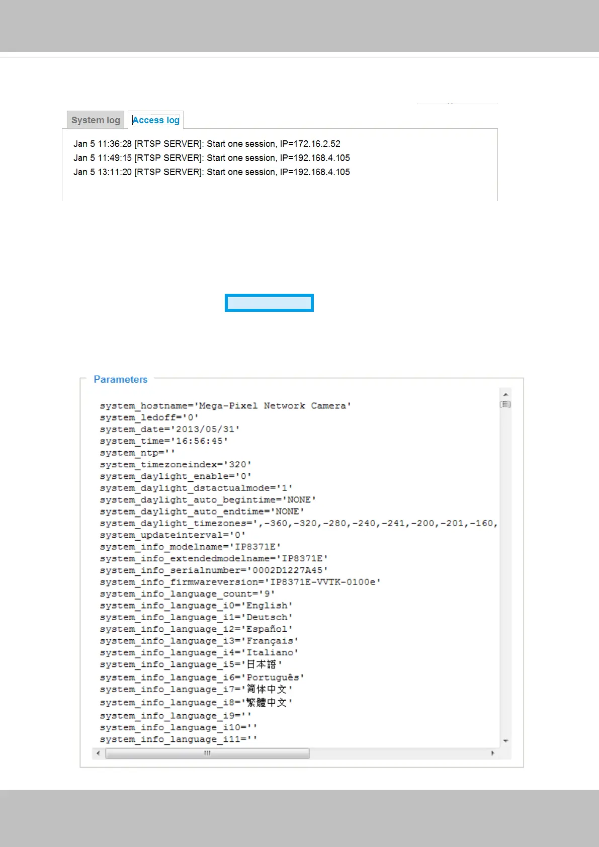 administrators) in a chronological order. The access log is stored in the Network Camera’s buffer