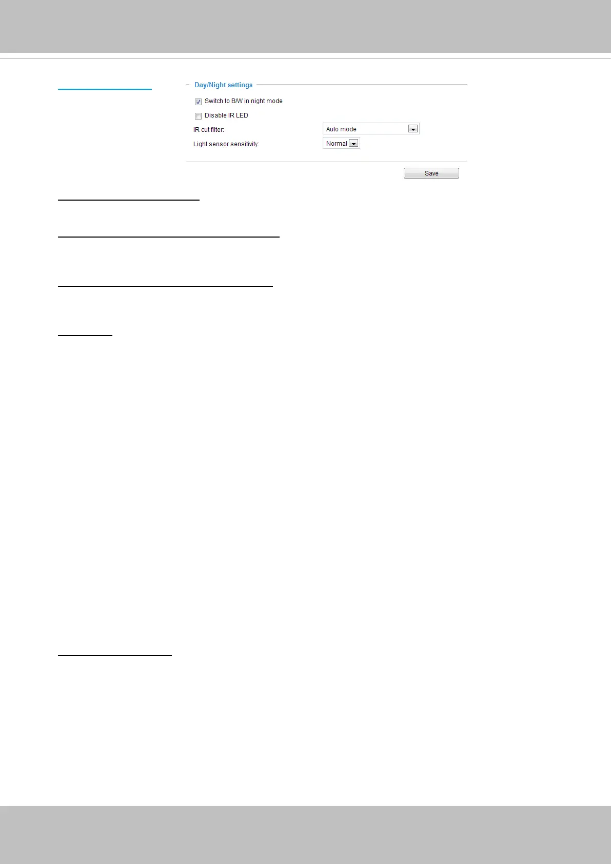 In night mode, the Network Camera switches off the IR cut lter at all times for the sensor to