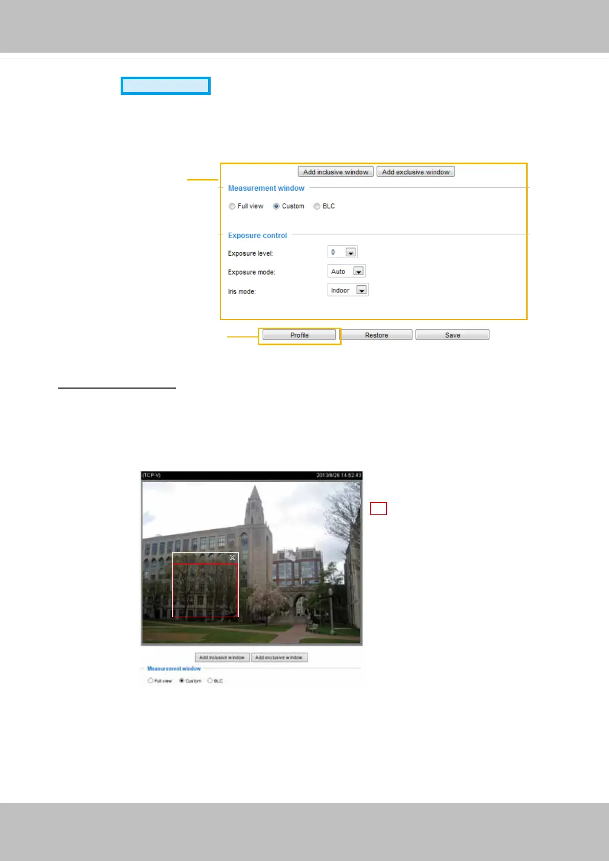 On this page, you can set the Measurement window, Exposure level, Exposure mode, Iris