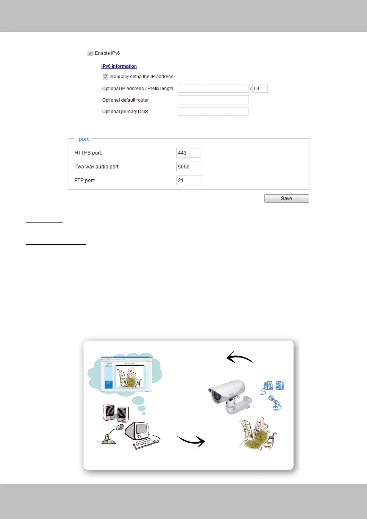 The Network Camera supports two way audio communication so that operators can transmit and receive