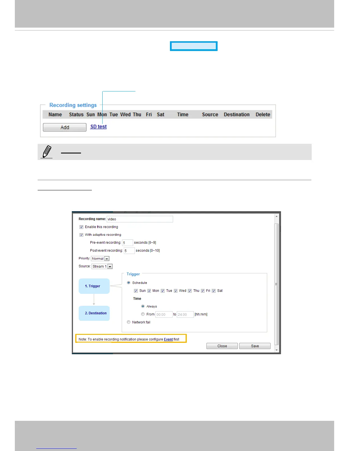 Click Add to open the recording setting window. On this page, you can dene the adaptive recording,
