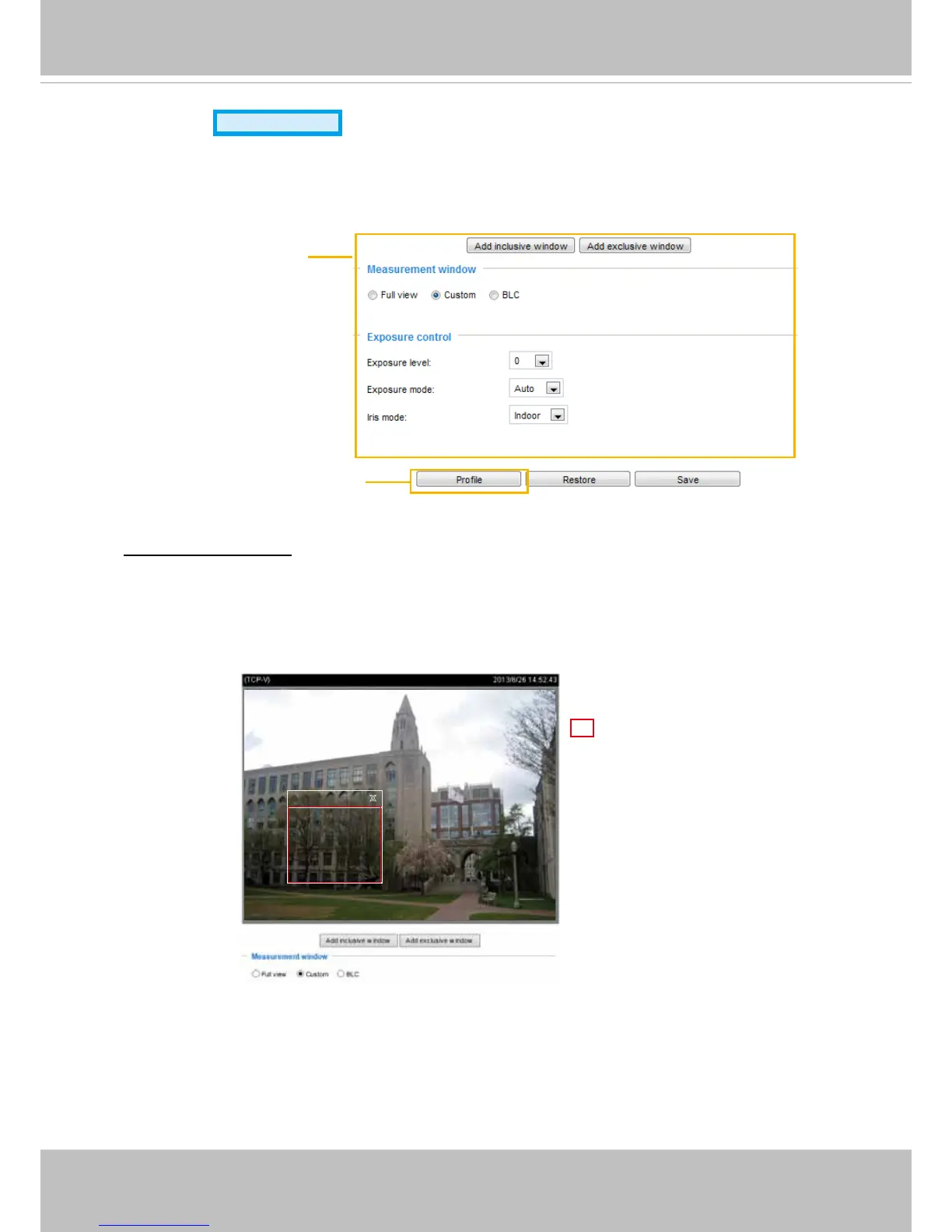 On this page, you can set the Measurement window, Exposure level, Exposure mode, Iris