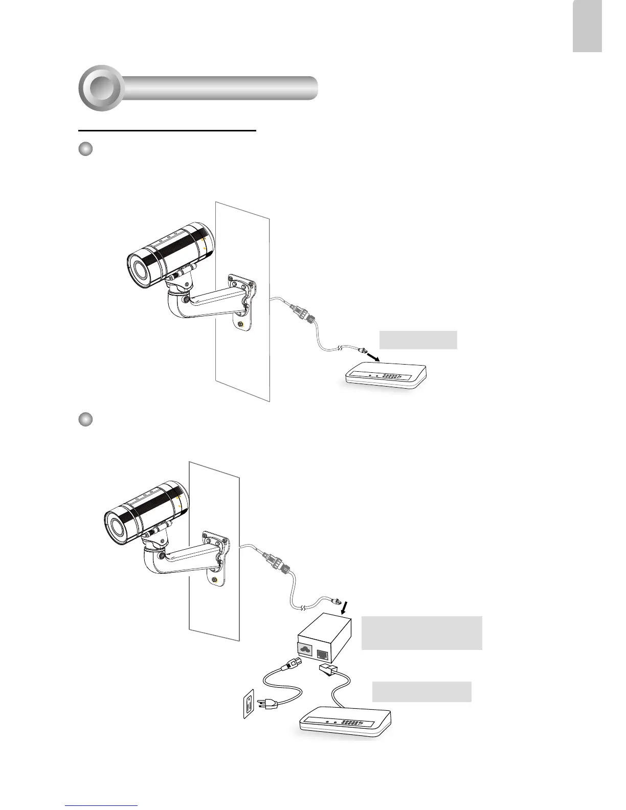 Use a PoE power injector (optional) to connect between the Network Camera and a non-PoE