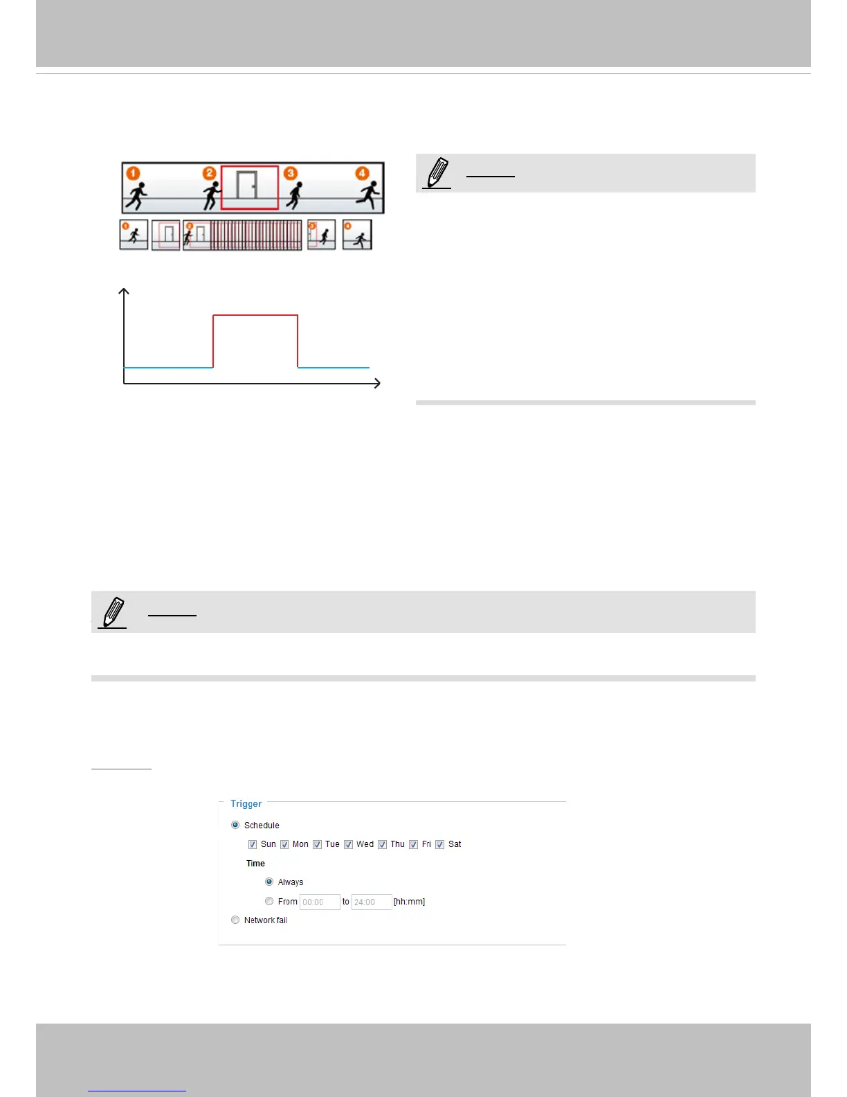 The alarm trigger includes: motion detection and DI detection. Please refer to Event Settings on page 95.