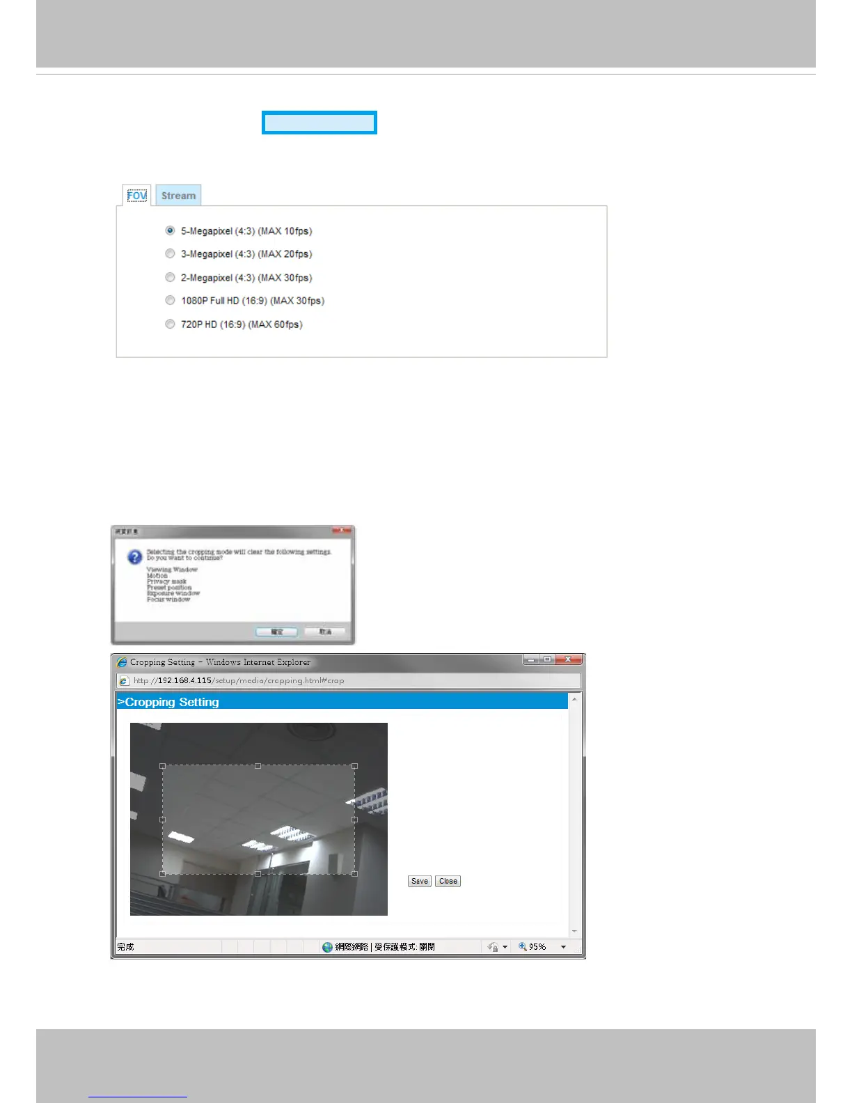 When you select a resolution other than the default maximum 5MP, a Cropping Setting window will