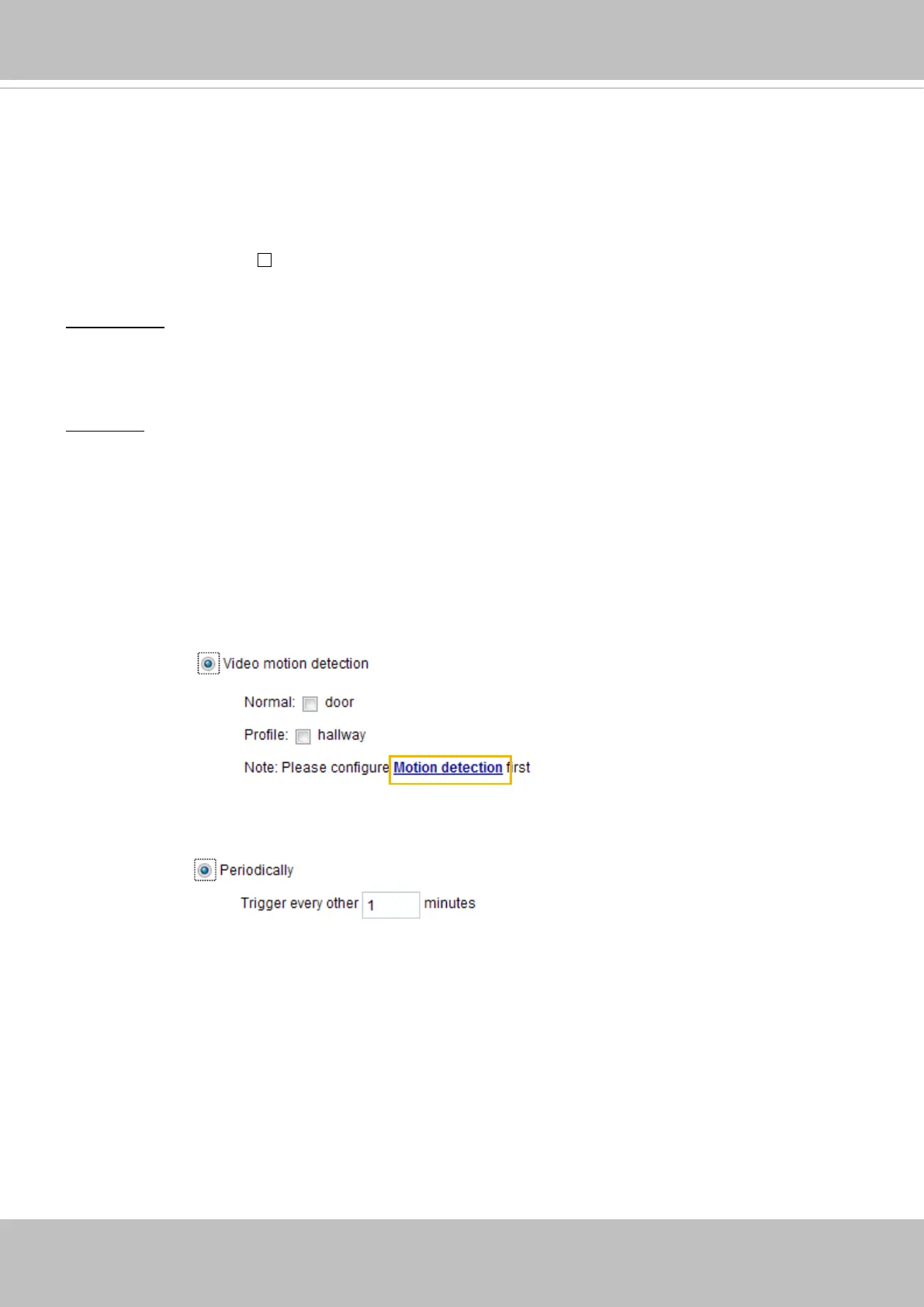 This option allows the Network Camera to trigger periodically for every other dened minute. Up to 999