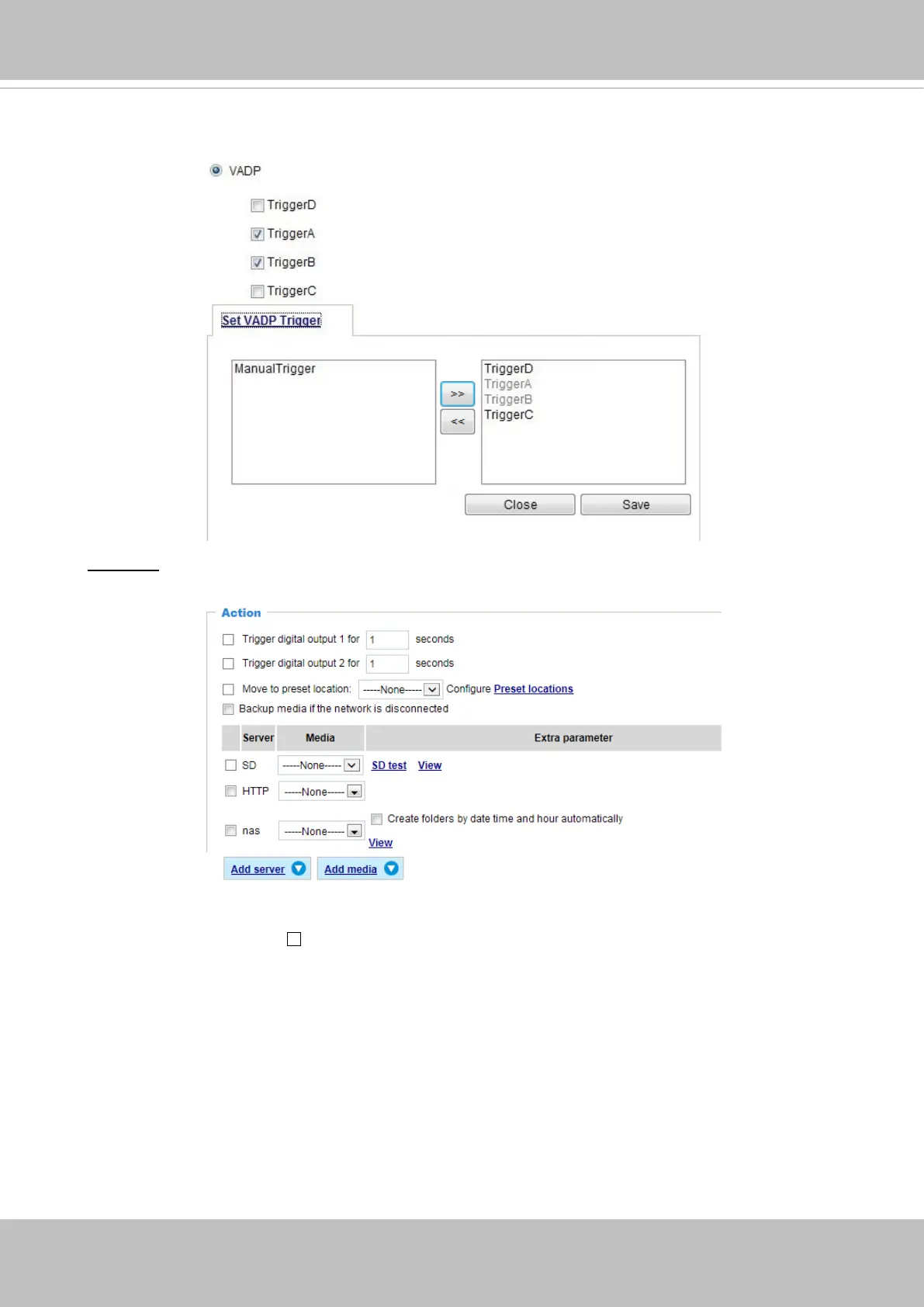 Dene the actions to be performed by the Network Camera when a trigger is activated.
