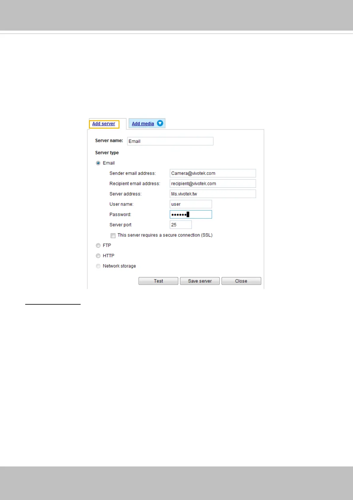 It is necessary to congure the server and media settings so that the Network Camera will know what