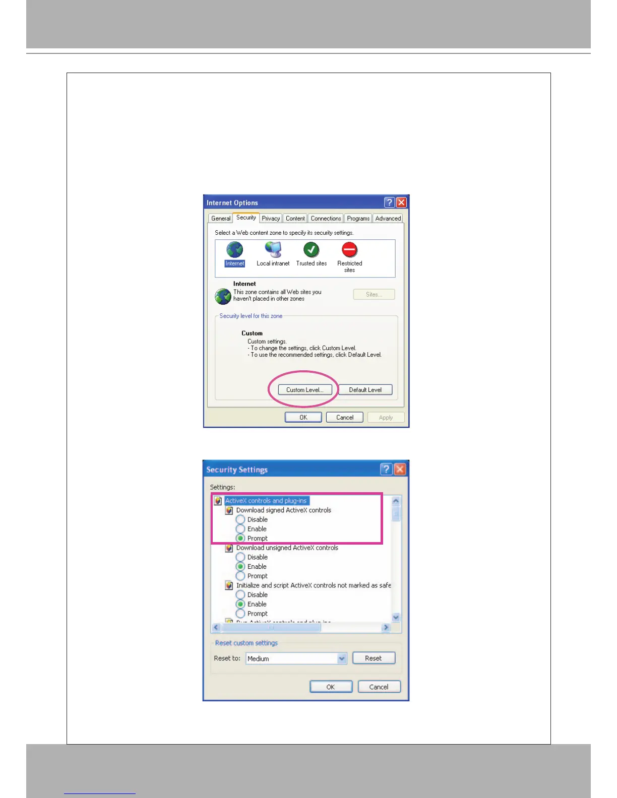 ► If you see a dialog box indicating that your security settings prohibit running ActiveX