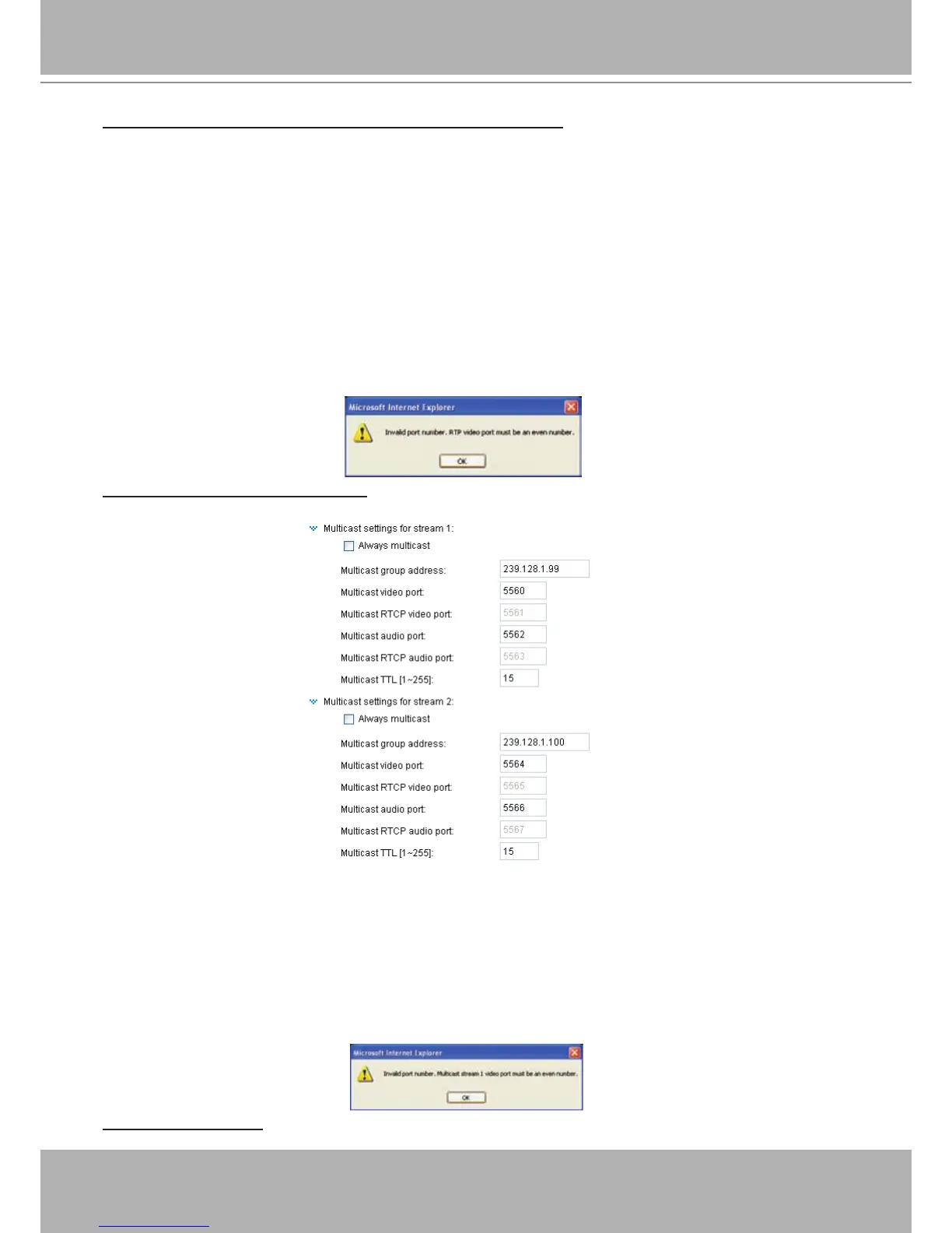 If the multicast RTP video ports are incorrectly assigned, the following warning message will be