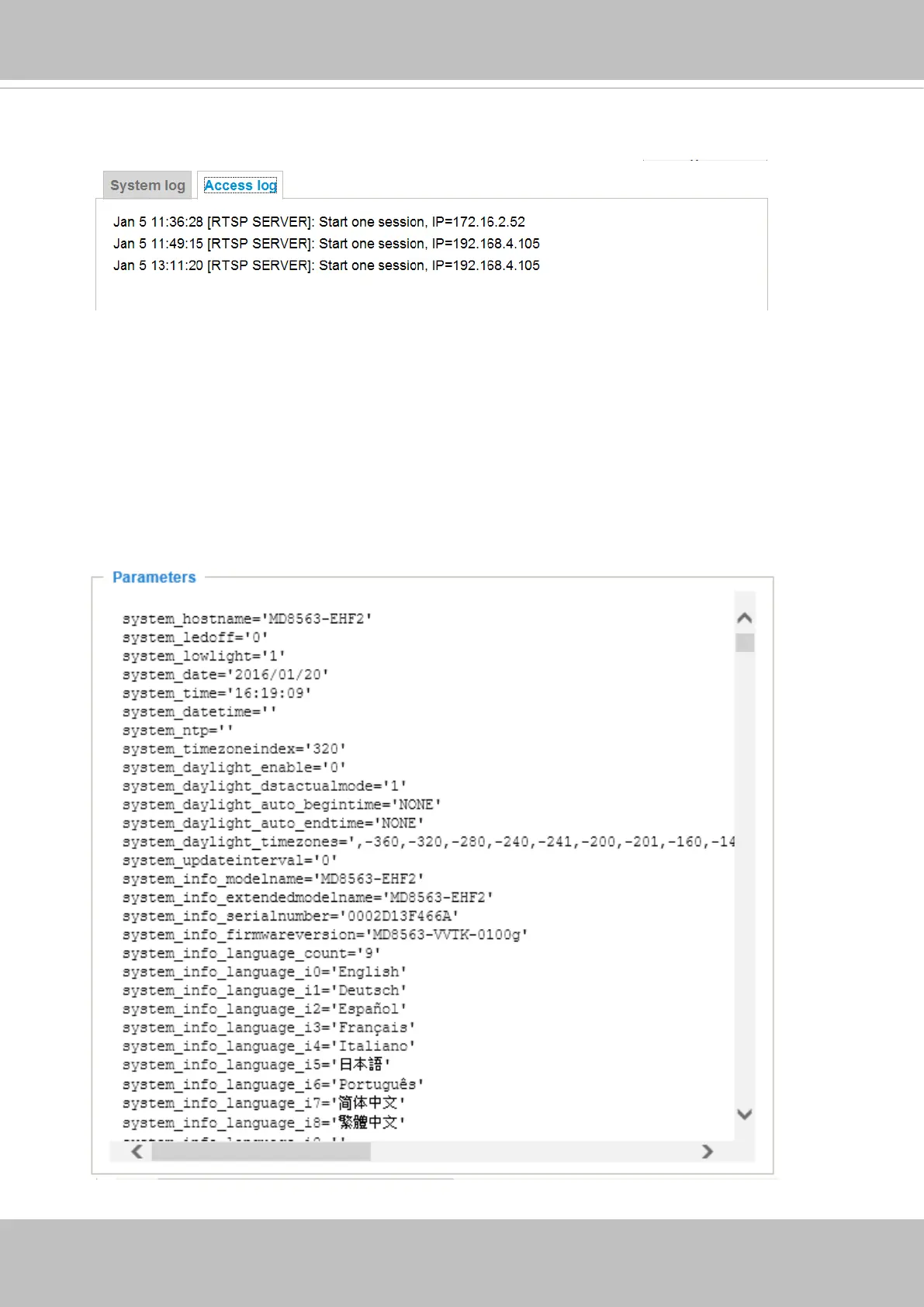 administrators) in a chronological order. The access log is stored in the Network Camera’s buffer