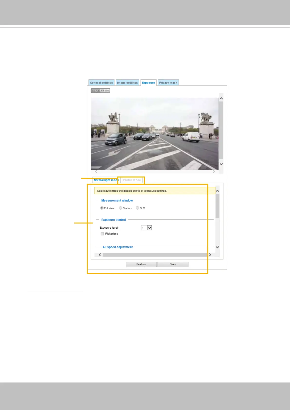On this page, you can set the Exposure measurement window, Exposure level, Exposure mode,